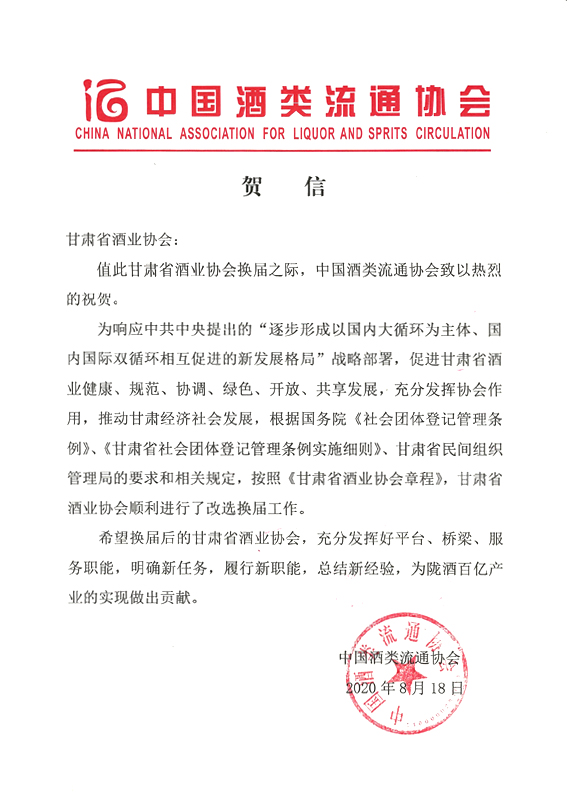 河西走廊是我国酒文明的重要发源地,酒文化源远流长。省酒协在省商务厅及有关部门的指导下,在充分挖掘甘肃酒文化基础上,在推进甘肃酒业产区建设、品牌建设、生态文明建设及推进酒业市场健康有序、绿色开放、共享发展等方面作出的工作和成绩,有目共睹。特别是协助推出陇酒百亿工程蓝图,现在制定和实施的陇酒走出去战略等工作,对甘肃酒业事业发展意义重大,将在甘肃酒业发展史上,留下重要意义。本次会议还将选举产生新一届理事会,在国际国内经济不确定增长的背景下,新一届理事会将面临着更多的问题,如何抓住构建国内大中型企业机会,趋利避害,如何在危机中寻得新的良机,在变利中开创新局,都需要新一届理事会做出答案。相信,新一届理事会在省商务厅等有关单位的指导下,必将在已经绘就的百亿陇酒的蓝图下,在已经制定并实施的陇酒走出去战略上开创新局,中国酒类流通协会将一如既往聚合能量,整合资源,全力支持甘肃酒业工作,为甘肃经济社会发展贡献力量。谢谢各位!