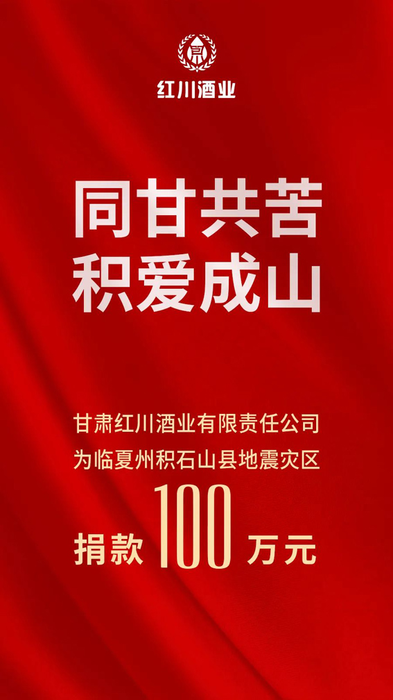 12月18日深夜,甘肃省临夏州积石山县发生6.2级地震,灾情牵动着全国人民的心。甘肃红川酒业有限责任公司时刻关注灾情、心系灾区人民,通过甘肃省红十字会向积石山灾区捐款100万元,用于帮助灾区人民渡过难关、重建家园。