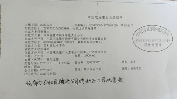 12月18日,甘肃临夏州积石山县发生 6.2级地震,造成财产和人员伤亡。时值寒冬,灾区最低温达零下十几度,受灾地区牵动着甘肃省酒业协会理事单位、陇南市西和县糖酒公司领导和全体职工。12月21日公司奉献爱心,通过西和县红十字会,为地震灾区捐款1万元!为灾区送去温暖,为灾区人们送去希望。