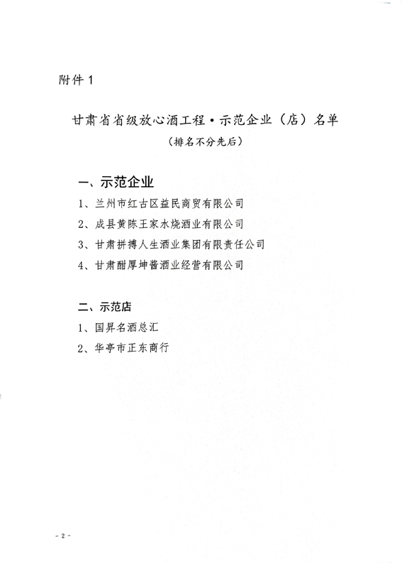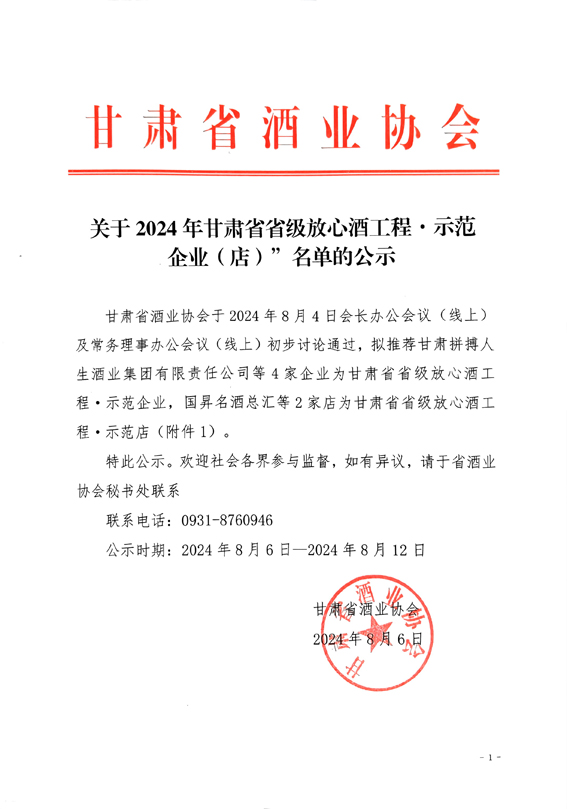 关于2024年甘肃省省级放心酒示范企业(店)名单的公示