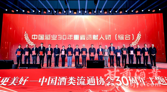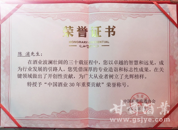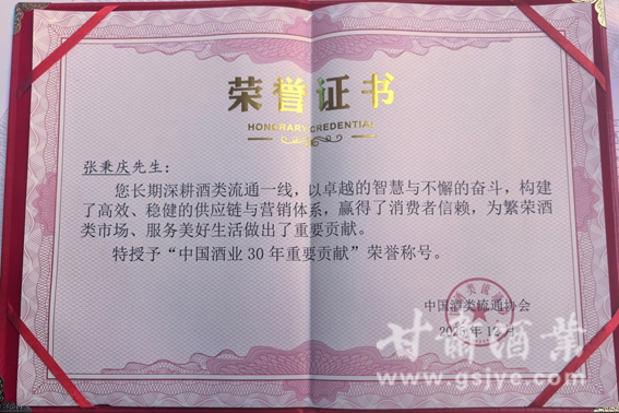 甘肃省酒业协会荣誉会长陈浦,中国酒类流通协会副会长、甘肃省酒业协会会长张秉庆分别被授予“中国酒业30年重要贡献”(综合类)及(流通类)荣誉称号。标志着赢得了行业的高度肯定和认可,体现了他们在行业发展中的努力与坚守,凭借长期深耕市场,以专业的造诣取得良好成果,为行业的繁荣与发展做出重要贡献。