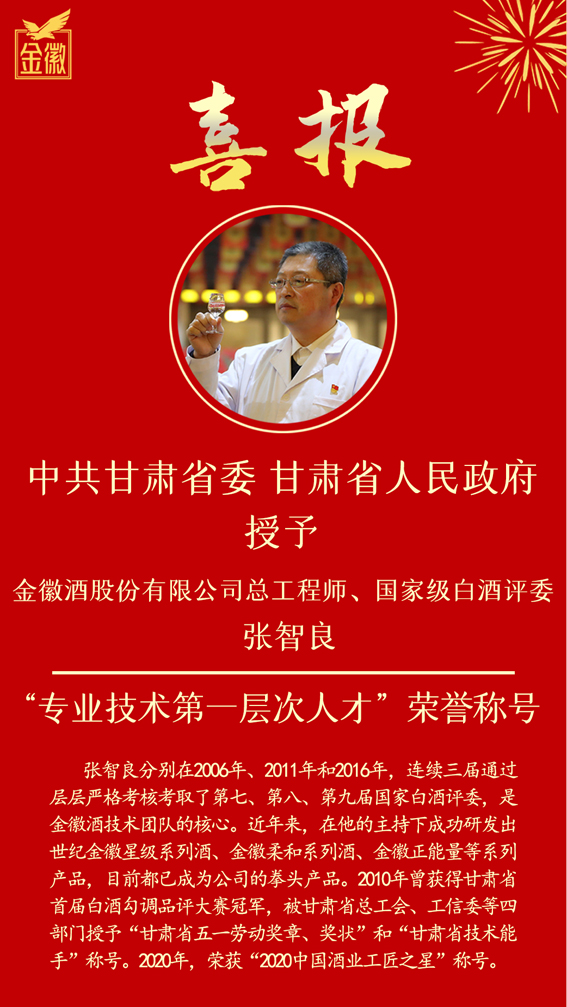 张智良深耕白酒行业30多年,从一名酿酒工成长为总工程师、国家级白酒评委,拥有极其丰富的白酒品评及酒体研发经验。他分别在2006年、2011年和2016年连续三届通过层层严格考核考取了第七、第八、第九届国家白酒评委,是金徽酒的品质大师和技术团队的核心骨干。近年来,由他牵头设计研发的世纪金徽星级系列酒、金徽柔和系列酒、金徽正能量系列、金徽年份等系列产品及第五代金徽星级系列产品——红五星、金徽高端定制酒、南钢集团定制酒等新产品,赢得了广大消费者青睐和大客户的一致好评。新品的研发和问世,丰富了金徽酒的产品线,满足了不同消费群体的需求,提升了金徽品牌知名度,为公司跨越发展和带动地方社会经济进步做出了突出贡献。他先后荣获2010年甘肃省首届白酒勾调品评大赛冠军,被甘肃省总工会、工信委等四部门授予“甘肃省五一劳动奖状”和“甘肃省技术能手”称号。2020年荣获“2020中国酒业工匠之星”称号。