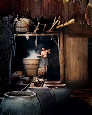 “经验丰富的酿酒人,五谷粮食,上好的酒曲,配以“资深”的酒窖池,经过配料、蒸煮糊化、入窖发酵、蒸酒等多个环节,塑造了这五谷发酵的天然醇香。酿酒人将新料、酒糟、辅料及水配合在一起,为糖化和发酵打基础。”