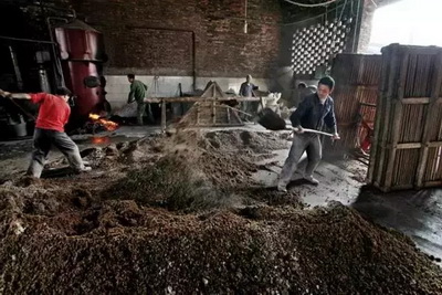 “酿酒人将冷却后的酒糟搅拌,扬渣,之后还要同时加入曲子和酒母。”