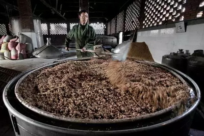 “从一粒粮食到一滴白酒,是古人的文化和智慧的结晶。此过程为润料,酿酒师将新料、酒糟、辅料及水配合在一起,为糖化和发酵打基础。”