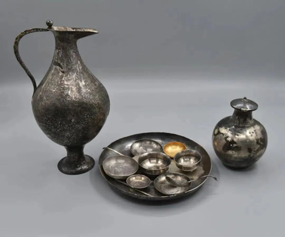 慕容智墓出土装有白葡萄酒的银胡瓶及成套餐具
