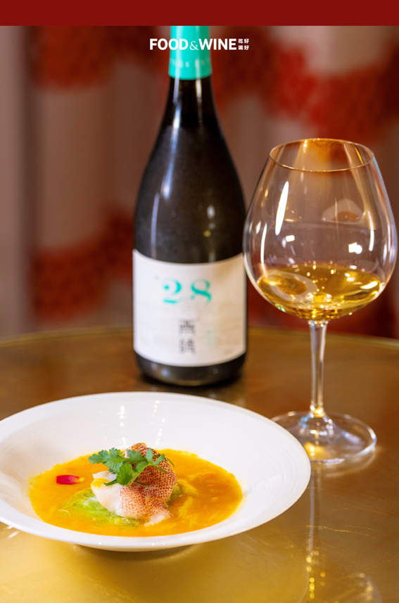 永利澳门餐厅「永利轩」出品的「鲜拆蟹肉莴笋烩海东星」配「西鸽酒庄 N28 霞多丽 2021」。新鲜东星斑与手拆蟹肉一同烩煮,搭配新鲜莴笋,弹牙爽滑与鲜甜脆爽完美融合;西鸽酒庄 N28 霞多丽 2021 在此次大赛中荣获最佳白葡萄酒、最具性价比葡萄酒。