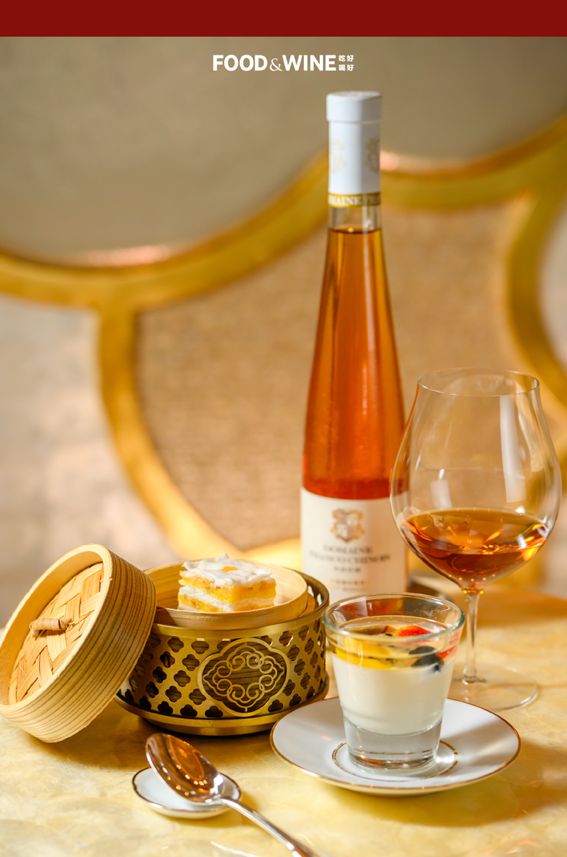 永利皇宫「谭卉」出品的「甜酒龙王杏布丁、蛋黄千层糕」配「中法庄园小芒森甜白 2016」。