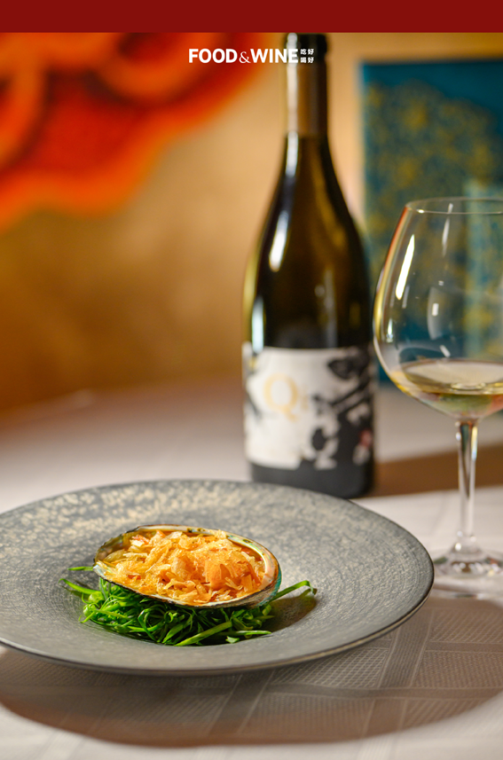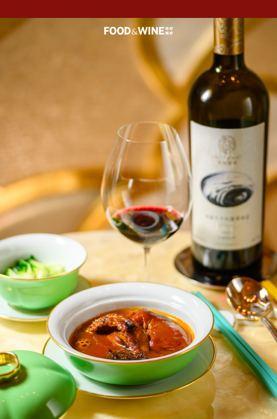 在永利「中国载誉葡萄酒品鉴月」餐酒搭配菜单中,永利皇宫餐厅「谭卉」出品的「锅烧鲍鱼猪仔脚」配「长和翡翠珍藏马瑟兰 2021」。